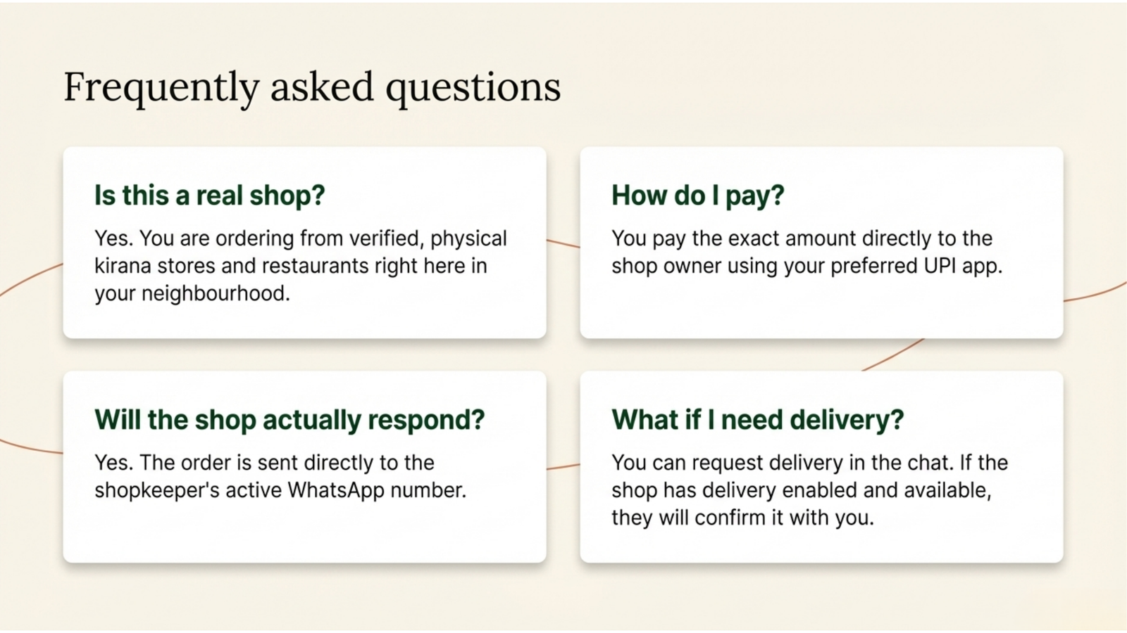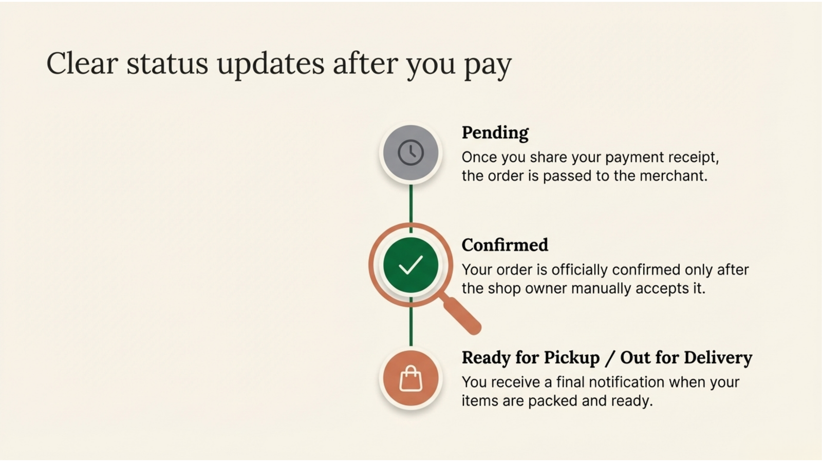 Customer ordering flow, WhatsApp entry points, direct payment clarity, and pickup-first local operations.