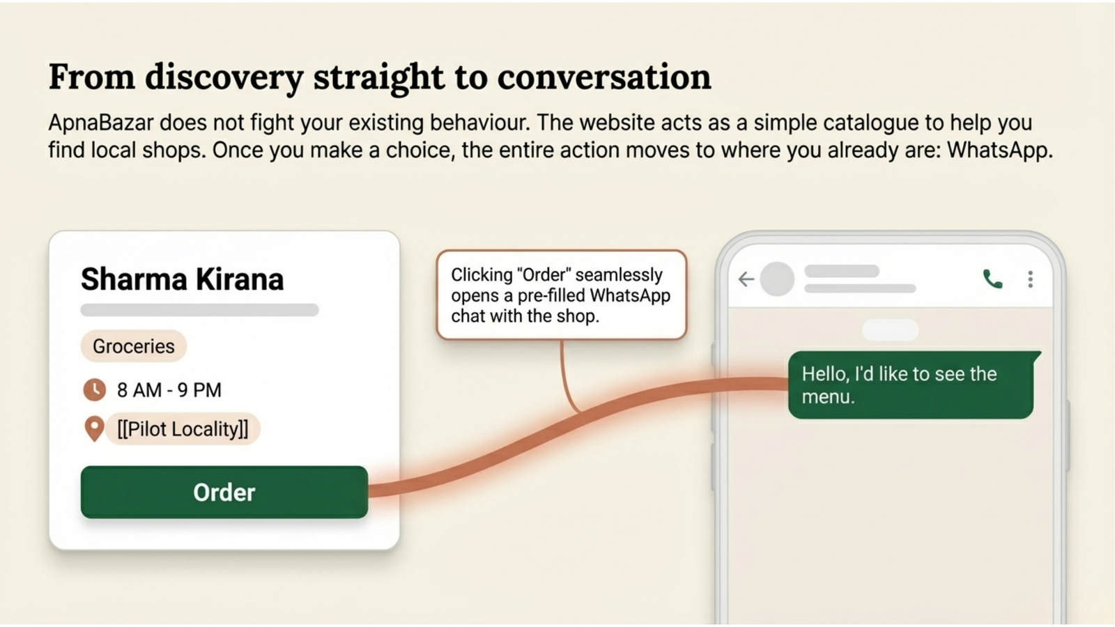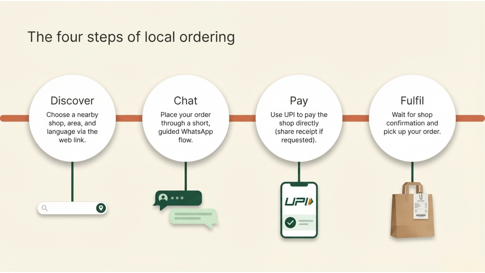 Customer ordering flow, WhatsApp entry points, direct payment clarity, and pickup-first local operations.